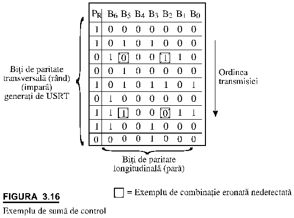 Exemplul prezentat in figura 3.16 foloseste paritatea impara pentru randuri si paritate para pentru coloane. De exemplu, se poate observa ca doi biti eronati intr‑un caracter nu pot fi detectati cu bitul de paritate transversala dar eroarea poate fi semnalata cu bitii de paritate longitudinala. Acest lucru nu este valabil atunci cand apar doi biti eronati pe aceeasi coloana (ca in figura). Deoarece probabilitatea de aparitie a acestui caz este mica metoda este folosita in cazul transmisiei (orientata pe bloc) pe linii cu probabilitate de erori mica. Pentru linii mai zgomotoase se folosesc metode mai riguroase de detectare a erorilor.