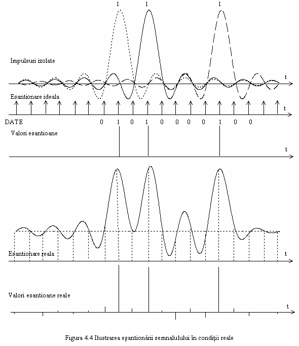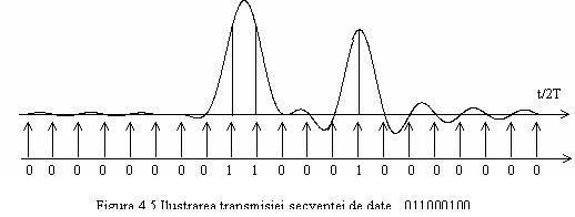 Acest lucru poate fi observat in figura 4.4. Esantionarea la momente diferite de cele ideale face ca in loc de 3 esantioane egale cu 1 si restul egale cu zero sa avem mai multe esantioane diferite de zero, adica interferenta intersimboluri.
