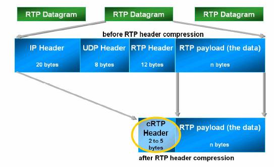 O examinare mai atenta a continului headerelor IP, UDP si RTP arata faptul ca multe din valorile campului nu se schimba in timpul unui transfer de informatie vocala-VoIP.Producatorii de routere au avantajul de a oferi o caracteristica numita 'compresia headerului RTP' sau cRTP.Cand cRTP este activat, marimea combinata a headerelor este comprimata intre 2 si 5 octeti.Economia de banda poate face loc pentru mai multe apeluri VoIP simultane pe aceeasi legatura (conexiune).Totusi, cRTP pretinde un schimb, compresia consuma din resursele procesorului si adauga intarzieri.Datorita acestei intrebuintari mari a procesorului si a intarzierilor adaugate, cRTP ar trebui folosit doar pentru legaturi de 512 kbps sau mai putin.