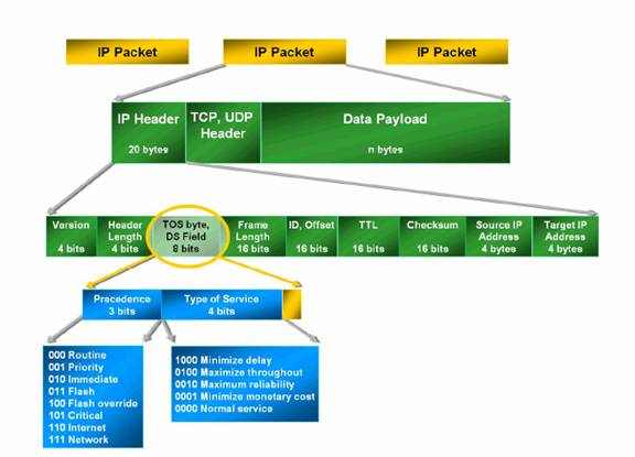 Octetul TOS si IP Precedence (Prioritate IP) au fost prima incercare pentru a oferi calitatea serviciului (QoS).Patru dintre bitii octetului TOS au fost destinati tipului de serviciu.Cei patru biti creaza patru clase de servicii: minimizare intarzierii (minimize delay) maximizarea rezultatului (maximize throughput), maximizarea coeficientului de siguranta (maximize reliability) si minimizarea costului (minimize monetary cost).