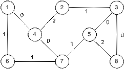 In figura alaturata avem 8 orase numerotate cu cifre de la 1 la 8, legate intre ele prin drumuri cu dublu sens. Pe fiecare drum este marcat costul de parcurgere al drumului. Scrieti toate drumurile din orasul 1 pana in orasul 8, drumuri care au costul minim. |