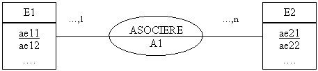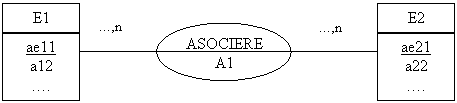 Fiecare entitate (E1 si E2) si asocierea dintre cele doua entitati, denumita ASOCIERE, se vor transforma in relatii sau tabele de forma: