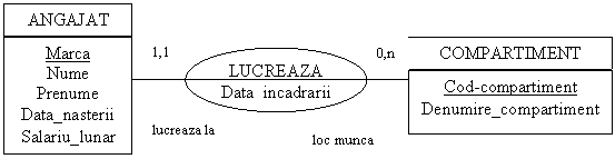 ANGAJAT(Marca,Nume,Prenume,Data_nasterii,Salariu_lunar,Cod-compart.,Data_incadrarii)