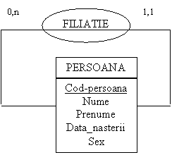 PERSOANA(Cod-persoana, Nume, Prenume, Data_nasterii, Sex, Cod-persoana-tata)