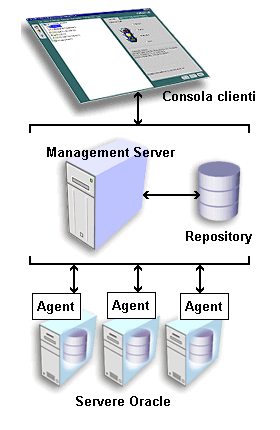 al doilea strat : Oracle Management Servers - OMS (servere de administrare Oracle) si Database Repository (depozit ce stocheaza toate datele de sistem, informatii despre nodurile administrate, date despre aplicatii, etc.) furnizeaza un strat intermediar flexibil pentru procesarea operatiilor de administrare ale sistemului;