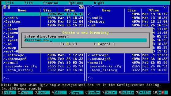 Apasand tasta 'F7' puteti crea un director (nou) in directorul curent. Daca doriti sa-l creati in alta parte, trebuie mai intai sa schimati directorul curent. Dupa apasarea tastei 'F7' va apare un dialog in care sunteti intrebat care va fi numele noului director. Tastati numele noului director si apasati 'Enter'