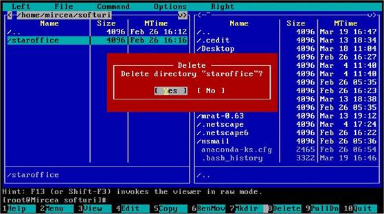 Midnight Commander este o 'clona' a programului Norton Commander. Este un program de tip 'shell' care asigura o interfata bazata pe meniuri. De regula este folosit pentru manipularea fisierelor si directoarelor, dar poate fi folosit si pentru transferuri prin ftp sau cautarea unui fisier pe disk.