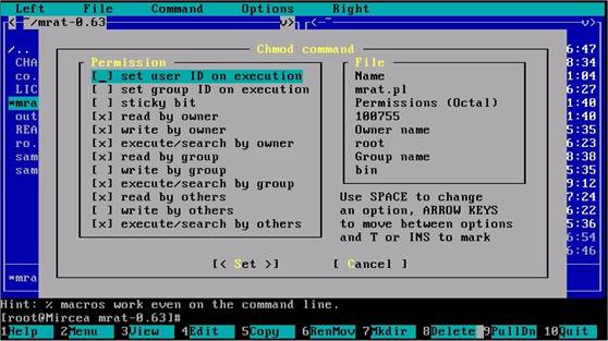 In caz de reusita, pe ecran va apare un dialog in care sunteti invitat sa modificati permisiunile asupra fisierului selectat. Selectarea se face cu mousele sau pozitionand cursorul pe permisiunea dorita si apasand 'space'. La sfarsit se apasa '[<set>]'