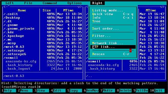 FTP (File Transfer Protocol) este protocolul cel mai raspandit in lume pentru transferarea fisierelor prin retea (Internet). Midnight Commander are un mod foarte util de a-l folosi: Puteti accesa un site intr-un mod asemanator cu un director local.