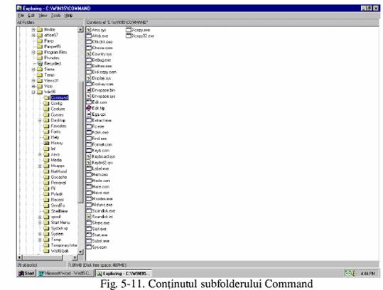 De exemplu, pentru a vizualiza continutul folderului Command, care este un subfolder al folderului Win95, in panoul din stanga trebuie mai intai desfasurata structura pentru My Computer Se selecteaza discul C si se efectueaza un click de mouse pe simbolul plus din dreptul denumirii etichetei discului C. Din structura de sufoldere afisate se selecteaza Command In panoul din dreapta vor fi afisate fisierele continute in folderul Command (vezi figura 5-11).