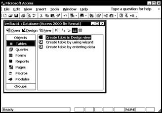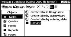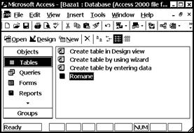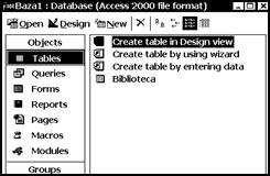 Este selectat primul obiect al bazei de date adica tabelele (Tables). In partea dreapta a ferestrei bazei de date aveti: Create tabel in Design view = creare tabel in vizualizare de tip proiect, Create tabel by using wizard = creare tabel utlizand un program expert, Create tabel by entering data = creare tabel prin introducere date.
