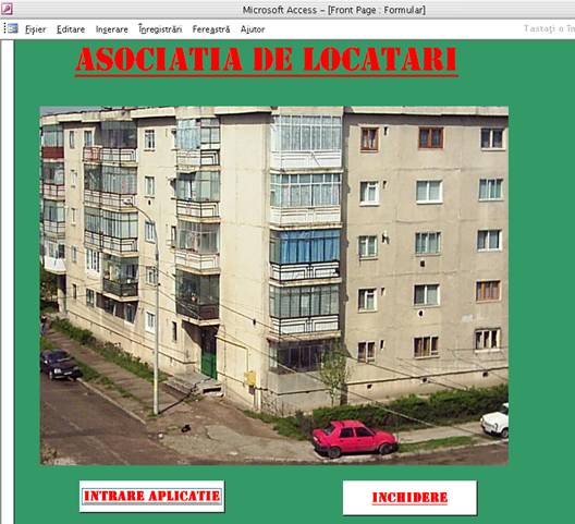 Fereastra contine doua butoane de executie. Pentru a intra in aplicatie se executa click pe butonul "INTRARE APLICATIE" iar pentru a iesi se executa click pe buronul "INCHIDERE".