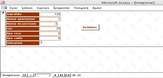 Tabela "Inregistrari" contine datele pentru fiecare apartament furnizate de locatarii apartamentului si are urmatoarele campuri: