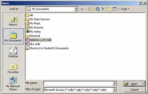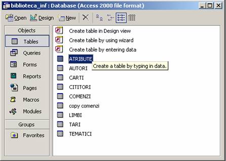 (de ex., BIBL) si localizarea ei (discul, dosarul).Obtinem o fereastra in care sunt disponibile cele 7 clase de obiecte Access.