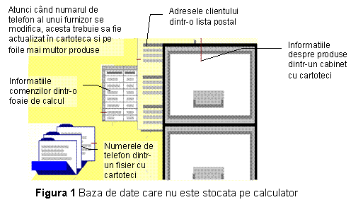 Baza de date este o colectie de informatii relative la un un anumit subiect sau scop, cum ar fi urmarirea comenzilor clientilor sau gestiunea unei colectii muzicale. Daca baza dvs. de date nu este stocata pe un calculator (vezi figura 1) sau numai unele parti ale acesteia, atunci veti urmari informatiile din mai multe surse, pe care va trebui sa le organizati si coordonati singuri.