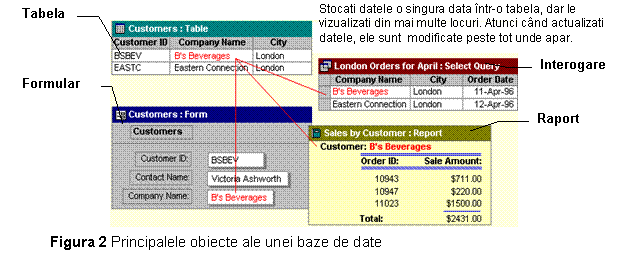 Folosind Microsoft Access puteti gestiona toate informatiile intr-un singur fisier baza de date. In interiorul fisierului, impartiti datele in containere separate de memorare numite tabele; vizualizati, adaugati si actualizati datele folosind formulare; cautati si regasiti numai datele dorite utilizand interogarile; analizati sau tipariti datele intr-o anumita forma cu ajutorul rapoartelor (vezi figura 2).