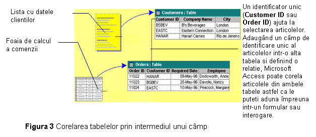 Pentru a memora datele, creati o tabela pentru fiecare tip de informatii pe care le urmariti. Pentru a strange impreuna datele din mai multe tabele intr-o interogare, formular sau raport definiti relatii intre tabele (vezi figura 3).