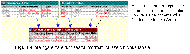 Pentru a cauta si regasi doar datele care indeplinesc conditiile specificate, inclusiv date din mai multe tabele, creati o interogare (vezi figura 4). De asemenea, o interogare poate actualiza sau sterge simultan mai multe articole si sa execute calcule asupra datelor.