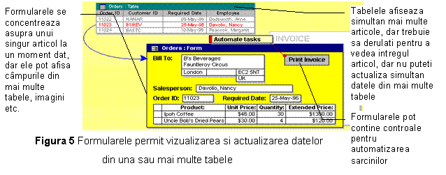Pentru a putea vizualiza, introduce sau modifica usor datele direct intr-o tabela creati un formular (vezi figura 5). Microsoft Access regaseste datele dintr-una sau mai multe tabele si le afiseaza pe ecran utilizand macheta aleasa cu Form Wizard sau folosind o macheta pe care ati creat-o in fereastra Form Design.