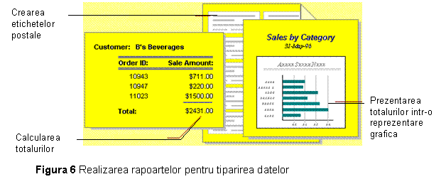 Pentru a analiza datele sau pentru a le tipari, creati un raport. Spre exemplu, puteti tipari un raport care sa grupeze datele si sa calculeze totaluri si un alt raport continand diferite date formatate pentru tiparirea etichetelor postale (vezi figura 6).