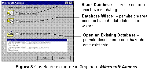 Atunci cand deschideti o sesiune Microsoft Access, pe ecran se afiseaza caseta de dialog Microsoft Access ce contine optiuni care va permit sa creati o baza de date noua sau sa deschideti una deja existenta (vezi figura 8). Pentru a crea o baza de date folosind un wizard, executati clic pe optiunea Database Wizard si apoi executati clic pe butonul OK.