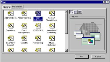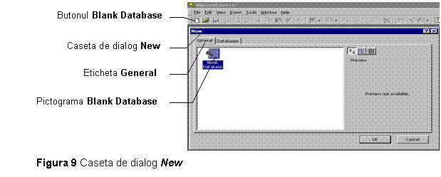 Daca aveti deja deschisa o baza de date sau caseta de dialog Microsoft Access este inchisa, atunci executati clic pe butonul New Database din bara instrumentelor Database (vezi figura 9). Pe ecran se afiseaza caseta de dialog New (vezi figura 9). Executati dublu-clic pe pictograma Blank Database din eticheta General.