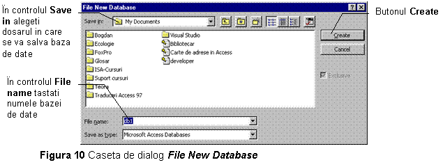 In caseta de dialog File New Database (vezi figura 10) selectati dosarul in care se va salva baza de date si tastati numele acesteia.