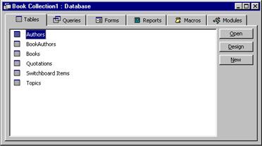Pentru a lucra cu toate obiectele dintr-o baza de date Microsoft Access folositi fereastra Database (vezi figura 7). Executati clic pe o eticheta (spre exemplu, Tables) pentru a vizualiza o lista a tuturor obiectelor de acest tip existente. Folosind butoanele din dreapta listei puteti deschide sau modifica obiectele existente si puteti crea noi obiecte.