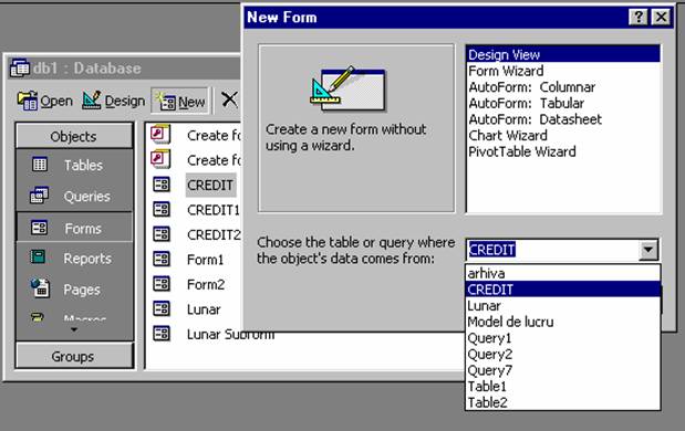 Formularele permit introducerea datelor in mai multe tabele asociate, pot contine butoane de comanda si campuri calculate, ceea ce nu este posibil la incarcarea directa a datelor in tabele. Crearea si modificarea formularelor se face in cadrul optiunii Objects->Forms. Access ofera mai multe modalitati de a crea un formular: Design View, Form Wizard, Autoform, Chart Wizard (fig.10