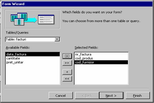 Modalitatea cea mai frecvent folosita pentru crearea formularelor este Form Wizard (fig. 11) si ea va fi descrisa in continuare pas cu pas: