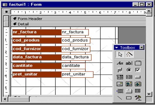 Pentru modificarea formularului astfel obtinut in sensul adaugarii/stergerii de campuri sau al adaugarii de controale (butoane de comanda, cutii de tip text, butoane de tip optiune, casete de validare etc) se deschide formularul in modul Design View (fig. 12) si se folosesc instrumentele din ToolBox.
