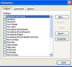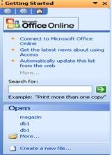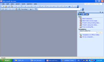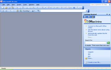 Odata lansat, ecranul initial Access va afisa, dupa cum se poate observa in figura 2, o fereastra cu bara de meniu similara tuturor aplicatiilor Microsoft Office si bara de instrumente cu contine butoanele specifice bazei de date Access si optional bara Web daca in prealabil a fost selectata urmind calea View / Toolsbar / Web