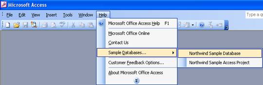 Inaite de a incerca sa realizam o baza de date este bine sa aruncam o privire asupra modului cum arata o baza de date deja creata apeland una din cadrul exemplelor Access, Northwind. Pentru a rula acest exemplu trebuie urmata calea urmatoarea (figura 5):