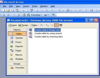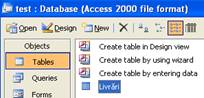 II. Tabele . In fereastra de dialog a bazei de date se da click in lista de obiecte pe Tables. In dreapta listei de obiecte apar cele trei optiuni utilizate in creearea tabelelor. Tabelele se creaza simplu folosind prima optiune Create tables in Design view.