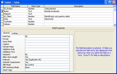 Urmatoarele randuri vor descrie celelalte campuri ale tabelului.