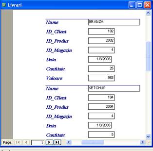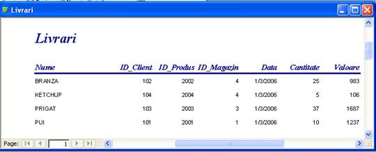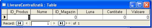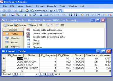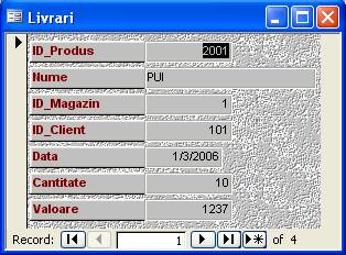 Tabelul Livrari are 7 campuri (coloane): ID_Produs, Nume, ID_Magazin, ID_Client, Data, Cantitate, Valoare si 4 inregistrari (linii) de date.