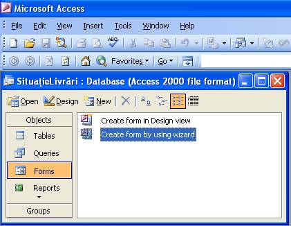 III. Formulare. In fereastra de dialog a bazei de date se da click in lista de obiecte pe Forms. In dreapta listei de obiecte apar cele doua optiuni utilizate in crearea formularelor.