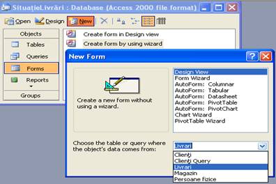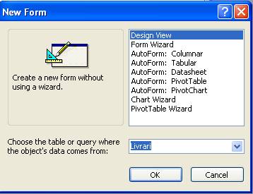 a) se selecteaza numele tabelului pentru care se doreste sa se realizeze formularul din lista de tabele.