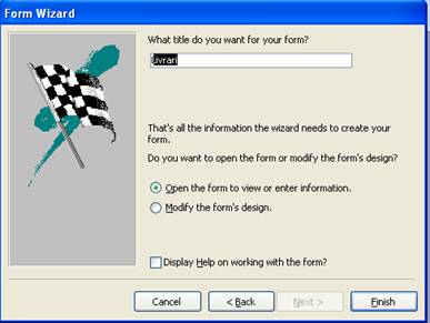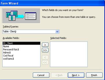 C. Stabilirea numelui formularului. Este recomandat sa se dea acelasi nume cu cel al tabelului. Se apasa butonul "Finish"