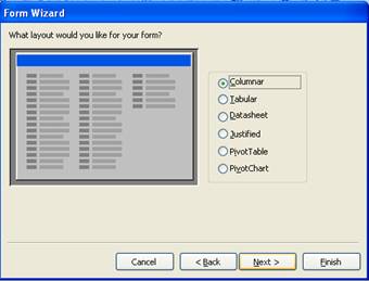 B. Selectarea "layout"-ului dorit din cele patru posibilitati de baza: Columnar, Tabular, Datashee si Justify dupa care se apasa butonul "Next".