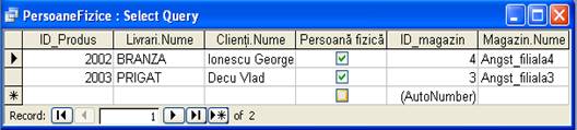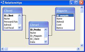 O astfel de relatie este de tip master/detail. Intr-o astfel de relatie o singura inregistrare master cum este cea din Tabelul Magazin cu campul Angst are patru inregistrari details in Tabelul Livrari. La fel si in Tabelul Clienti o singura inregistrare master corespunzatoare campului ID_Client poate avea una sau mai multe inregistrari details associate. Clientul cu codul de identificare 101 si 103 au cate o inregistrare details iar cel cu codul de identificare 102 are doua inregistrari details associate.