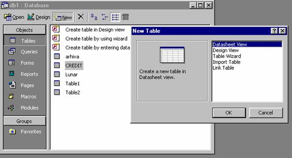 Access ofera mai multe modalitati de creare a unui tabel: Datasheet View, Design View, Table Wizard, Import Table, Link Table (fig. 2)