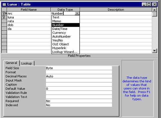 Indexed: se precizeaza daca un camp, altul decat cheia primara, este index in tabela si daca se accepta duplicarea valorilor lui; optiunile posibile: No, Yes (Duplicate OK) si Yes (No Duplicate);
