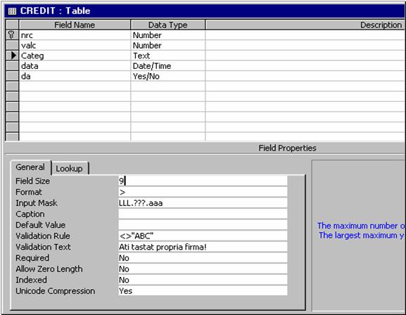 Exemplu de folosire a proprietatilor unui camp: Campul Categ din tabela de mai jos este de tip Text, are lungimea maxima de 9 caractere si are setate urmatoarele proprietati: