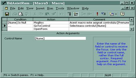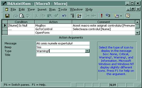 In exemplul din Figurile 3 si 4 se trateaza posibilitatea ca un utilizator sa uite sa introduca in campul Nume al formularului numele expertului; in acest caz, atunci cand se selecteaza controlul urmator, Prenume, apare mai intai o caseta cu un mesaj de atentionare dupa care se selecteaza automat controlul asociat numelui expertului; daca utilizatorul completeaza insa informatia privind numele expertului atunci se deschide un alt formular in care se pot filtra clientii expertului respectiv, manevra care trebuie sa se execute si dupa revenirea la completarea numelui. In exemplul prezentat, macrocomanda a fost asociata proprietatii OnGotFocus a controlului Prenume din formularul F_PtMacro_Experti din BD AsistRom .