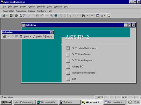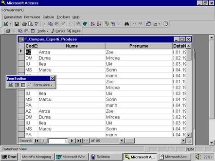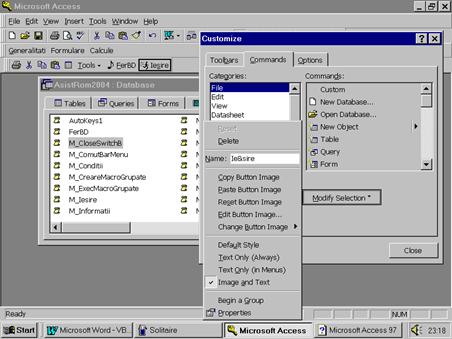 In Figura 18 este prezentat un toolbar si un barmeniu personalizat. Toolbarul (mobil) numit "UnToolbar" contine 4 iconi predefiniti copiati de pe toolbarul Standard, o comanda copiata din categoria All Tables si 2 iconi proprii care, prin macrocomenzile atasate, afiseaza fereastra bazei de date (macrocomanda FerBD), respectiv: inchid aplicatia (macrocomanda M_Iesire). Barmeniul numit "UnBarmeniu" contine 3 meniuricreate ca mai sus: GENERALITATI (cu comenzile INFORMATII, AFISARE BD, MINIMIZARE, MAXIMIZARE, SAVE si IESIRE, grupate in 4 categorii), FORMULARE (cu comenzile OPENDESIGNVIEW,OPENFORMVIEW si OPENDATASHEET VIEW care afiseaza un acelasi formular in cele trei moduri permise), CALCULE (cu comenzile CLIENTI si DATA CALENDAR care afiseaza doua interogari de calcul) si comanda predefinita TOOLBARS precum si meniul predefinit HELP. Evident, pentru acest nou toolbar si barmeniu, in prealabil au fost create macrocomenzile M_Informatii, FerBD, M_Maximize, M_Minimize, M_Iesire, M_OpenF_Design, M_OpenF_Form, M_OpenF_Datasheet, M_OpenQCampCalcClientiFirma, M_OpenQCampCalcDataCalend.
