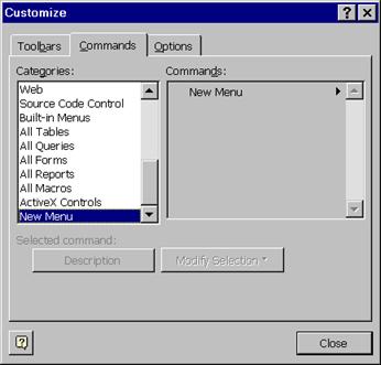 OK T un toolbar vid apare pe suprafata ecranului iar numele lui este adaugat in caseta-lista Toolbars din fereastra Customize. Acest toolbar .poate fi "parcat" deasupra sau sub barmeniul Standard al Ms Access, tranformandu-se astfel intr-un barmeniu.