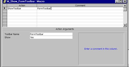 Proiectantul aplicatiei poate atasa unui formular anume un toolbar personalizat care sa ofere o functionalitate speciala numai acelui formular (la inchiderea formularului toolbarul dispare). Pentru aceasta se creeaza macrocomenzi care utilizeaza actiunea ShowToolbar cu valori diferite pentru argumentul Show: Yes, respectiv No, astfel:
