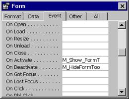 n in linia OnDeactivate se alege numele macrocomenzii care ascunde toolbarul / barmeniul dorit T