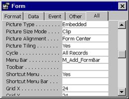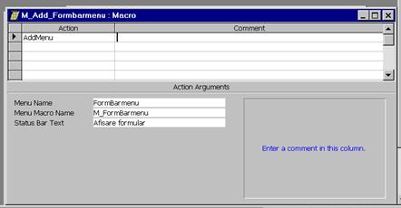 in linia MenuBar se introduce numele macrocomenzii care afiseaza barmeniul (aici M_Add_Formbarmenu; Figura 25)